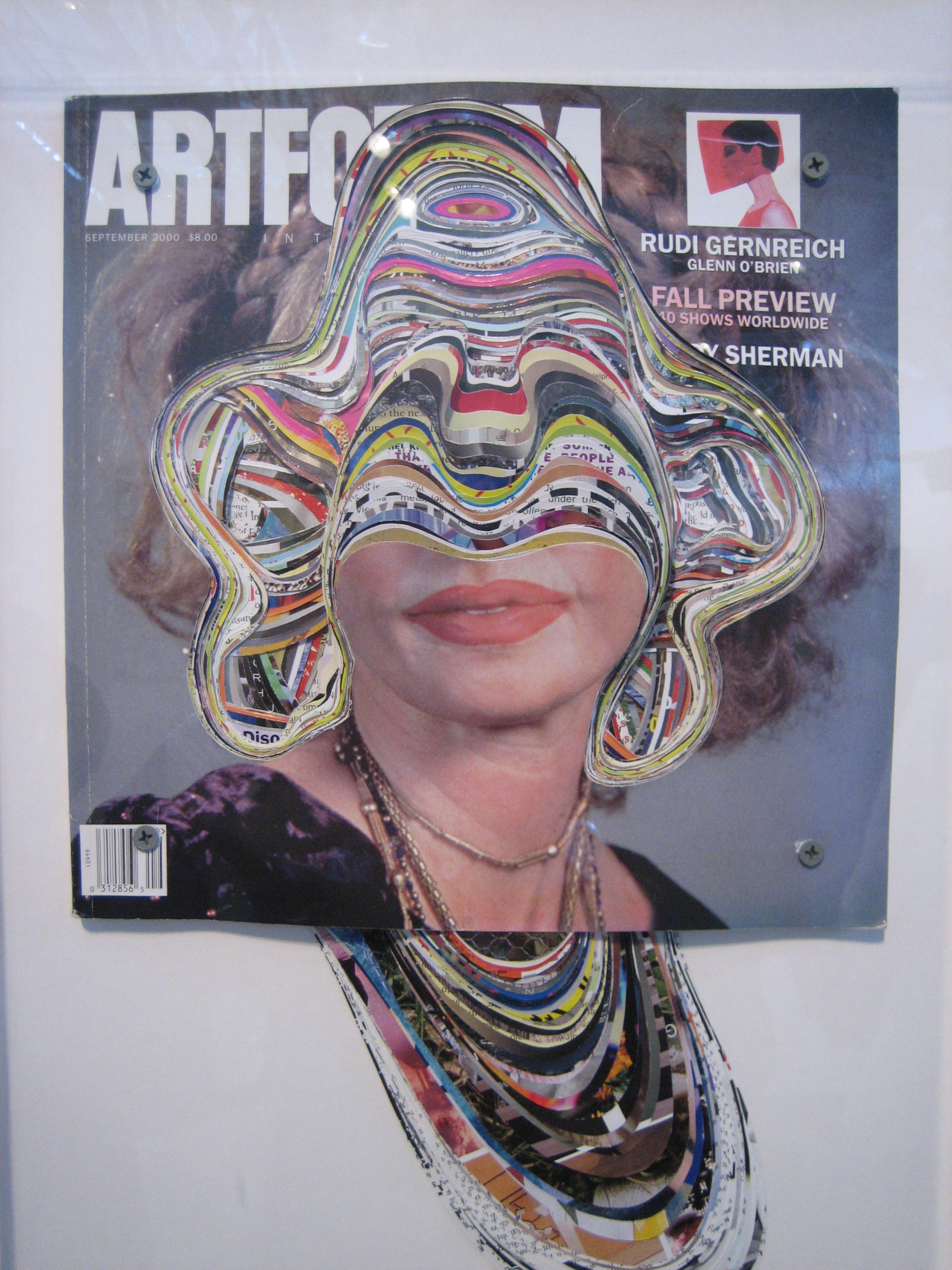 Francesca Pastine, “Artforum #47, Unsolicited collaboration with Cindy Sherman, Mask Series,” 2013. Hand-cut Artforum magazines, plexiglass, wood, screws, 19 x 13 x 4 inches.