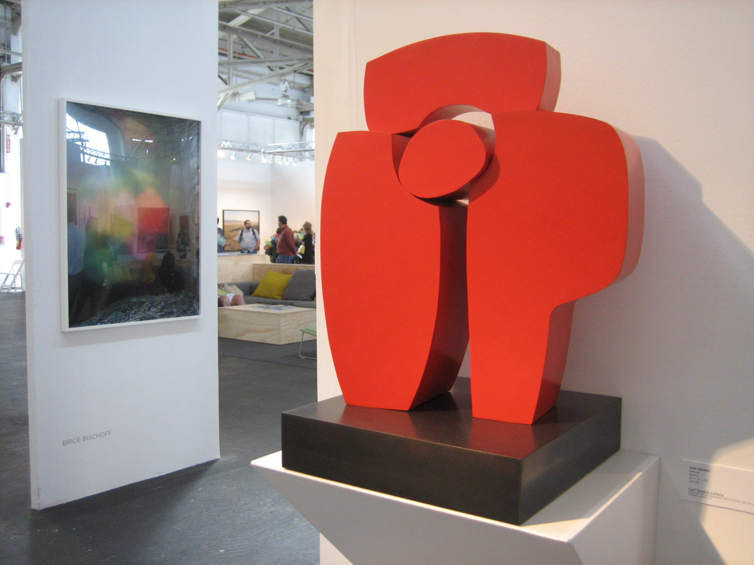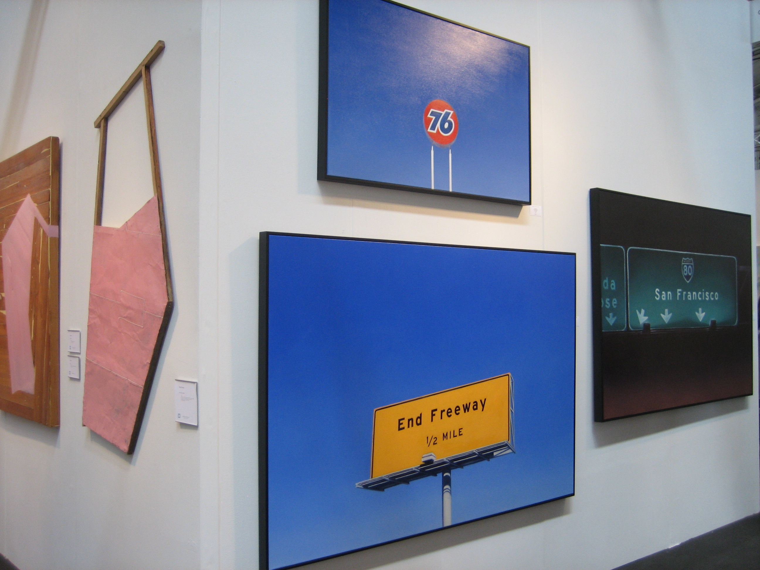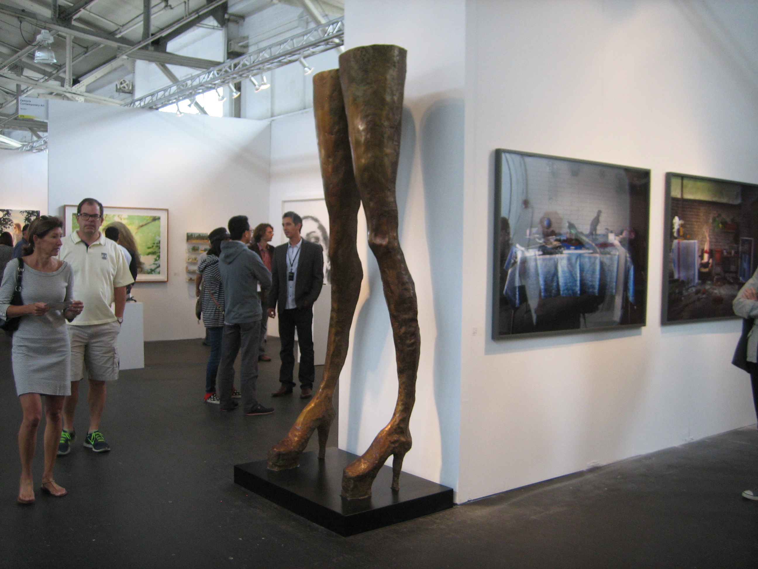 The latest rendition of Art Market San Francisco, May 15-18, 2014, was a mixed presentation of various forms of contemporary art, from high brow to low.  On view were works in all shapes and sizes, from painting to sculpture to videography, presented by over 70 galleries from across the nation.  Touted as the Bay area’s only contemporary and modern art fair, the cavernous location in Fort Mason Pavilion provided more than enough space for galleries to display and hawk their wares; maybe too much space.  This writer visited on Saturday, May 17 and found the place to be rather empty of visitors.  Has interest in giant art markets peaked?  Are art collectors finding this set up too exhausting, too impersonal, too uninspiring, too expensive?  I roamed the pavilion searching for new and exciting art; something innovative that would knock my socks off; art that would make my eyes pop or the hairs on my neck stand up.  Alas, this was not to be.  Don’t get me wrong, the event was worth the visit, it just wasn’t over the top, so to speak.  Here are photos I snapped of some of the fair’s highlights: