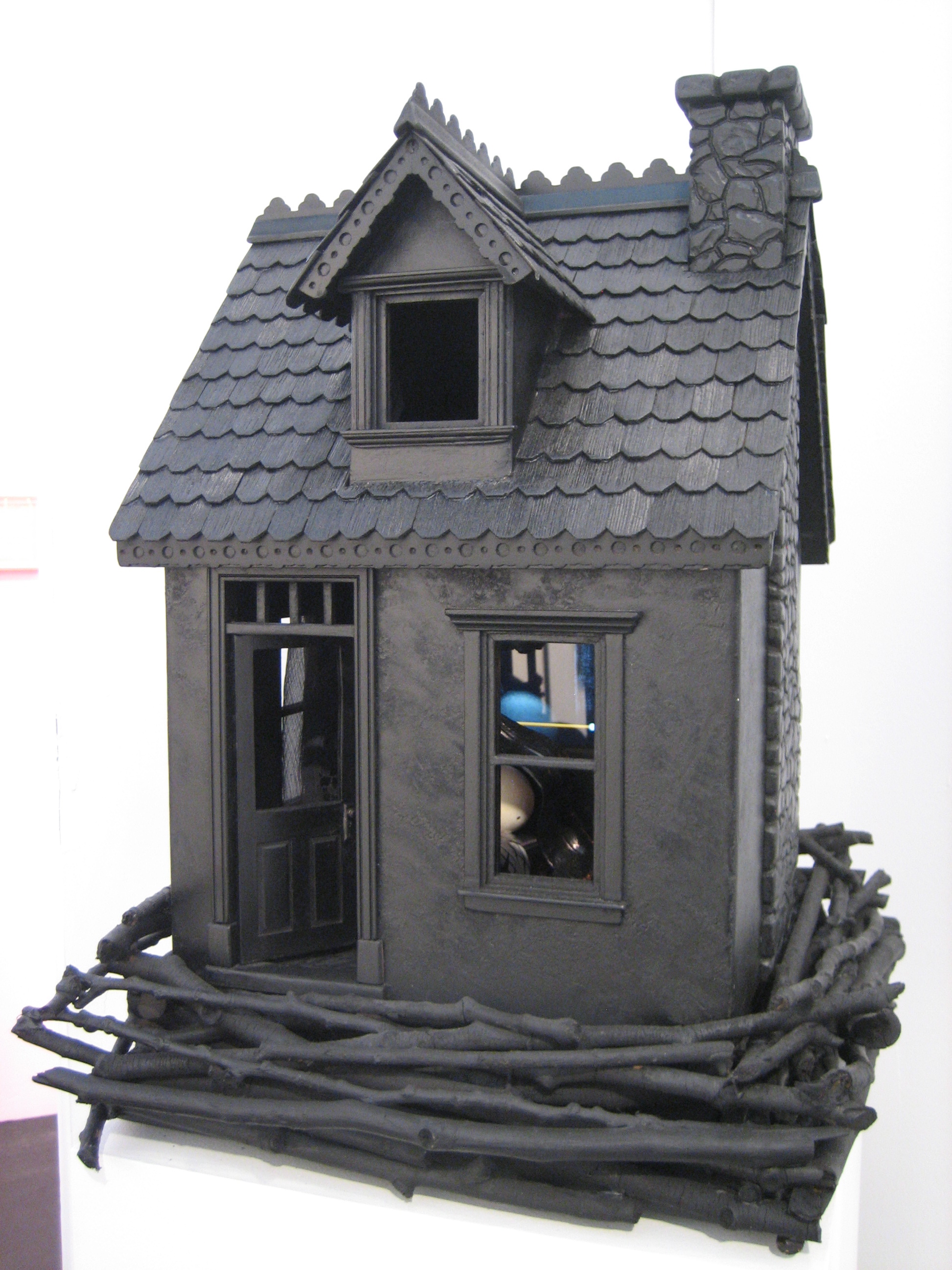 Stacey Steers, “Night Hunter Cottage,” 2011.  Mixed media: video, wood, paint, electrical, 20 x 16 x 15 inches.